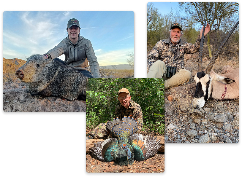 A wide range of exciting species. From the fierce desert Javelina to the impressive Oryx, the challenging Aoudad (Barbary Sheep), or the colorful Ocellated Turkey, and more, every pursuit adds a new dimension to your hunting adventure.